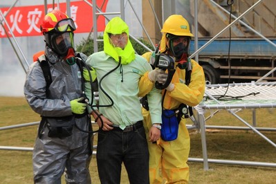 整場演習(xí)的大部分環(huán)節(jié)由梅思安(MSA)安全培訓(xùn)中心承辦,梅思安(MSA) 安全培訓(xùn)中心經(jīng)理孫健先生擔(dān)任此次演練的總策劃及現(xiàn)場解說員。整個(gè)演練共分四個(gè)部分,首先開始的是“密閉空間應(yīng)急救援”配備了正壓式長管供氣呼吸器的隊(duì)員 在其他隊(duì)友的協(xié)助下,通過營救單元的滑輪繩索,快速下降到罐底,為被救者套上正壓式緊急呼吸器的頭罩施救,并利用營救單元的滑輪繩索施救。 接下來“救援技術(shù)展示及高空救援演練”詳細(xì)展示了表演了高空救援的救援技術(shù)。第三科目為化學(xué)氣體泄漏逃生及應(yīng)急救援演練。救援隊(duì)員利用了先進(jìn)的熱成像儀進(jìn) 行搜索發(fā)現(xiàn)了中毒者倒地的地點(diǎn),利用所帶正壓式呼吸器他救功能救出被救者。隊(duì)員利用 MSA BD2100 一分鐘快充功能,可以立刻相互充氣,確保任務(wù)完成。而最后一部分上海石化消防支隊(duì)開展了精彩的消防演習(xí)。