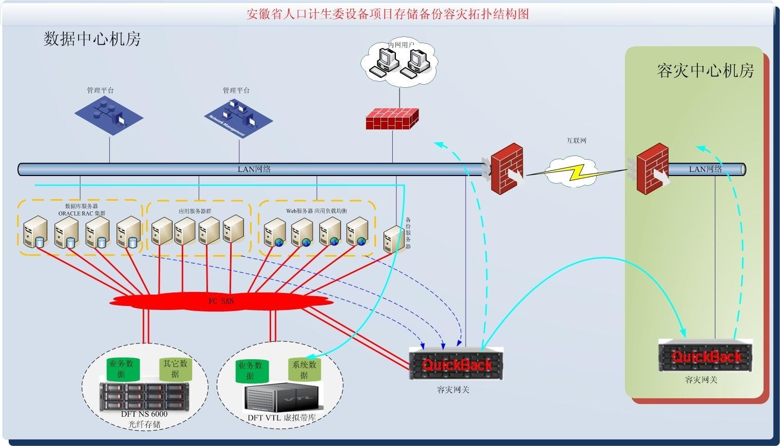 為保證數(shù)據(jù)完整性、安全性及應(yīng)用系統(tǒng)7*24小時(shí)持續(xù)運(yùn)行,DFT 根據(jù)目前安徽省人口計(jì)生委設(shè)備項(xiàng)目建設(shè)需求和現(xiàn)有環(huán)境,為安徽省人口計(jì)生委量身打造了一套完善的數(shù)據(jù)集中存儲(chǔ)容災(zāi)方案。該方案在現(xiàn)有應(yīng)用系統(tǒng)數(shù)據(jù)存儲(chǔ)方式的基礎(chǔ)上,根據(jù)應(yīng)用系統(tǒng)和數(shù)據(jù)的重要程度,建設(shè)集中存儲(chǔ)系統(tǒng),并在此基礎(chǔ)上逐步建設(shè)應(yīng)用系統(tǒng)集群,提高各應(yīng)用系統(tǒng)的高可用性。方案中,采用 DFT NS-U6000統(tǒng)一存儲(chǔ)磁盤(pán)陣列來(lái)滿足安徽省人口計(jì)生委設(shè)備項(xiàng)目數(shù)據(jù)集中存儲(chǔ)需求。服務(wù)器系統(tǒng)通過(guò)光纖交換機(jī)與存儲(chǔ)連接,4臺(tái) ORACLE 數(shù)據(jù)庫(kù)服務(wù)器通過(guò) RAC 做數(shù)據(jù)庫(kù)集群;在安徽省人口計(jì)生委設(shè)備項(xiàng)目中心機(jī)房配置一臺(tái) DFT VTL-16 虛擬磁帶庫(kù)實(shí)現(xiàn)數(shù)據(jù)快速備份和恢復(fù);并為安徽省計(jì)生委全員人口管理系統(tǒng)配置2臺(tái) DFT QuickBack 應(yīng)急容災(zāi)網(wǎng)關(guān)設(shè)備產(chǎn)品來(lái)滿足安徽省人口計(jì)生委設(shè)備項(xiàng)目中的數(shù)據(jù)容災(zāi)需求,兩臺(tái)容災(zāi)網(wǎng)關(guān)設(shè)備通過(guò)互聯(lián)網(wǎng)按照設(shè)定的策略自動(dòng)將數(shù)據(jù)同步鏡像到遠(yuǎn)端的災(zāi)備中心的存儲(chǔ)設(shè)備中,使各業(yè)務(wù)系統(tǒng)在不受影響的情況下實(shí)現(xiàn)數(shù)據(jù)的同城災(zāi)備。該方案在確保數(shù)據(jù)的安全和應(yīng)用系統(tǒng)的持續(xù)運(yùn)的同時(shí),大大降低了建設(shè)成本,并實(shí)現(xiàn)了其預(yù)期建設(shè)目標(biāo):