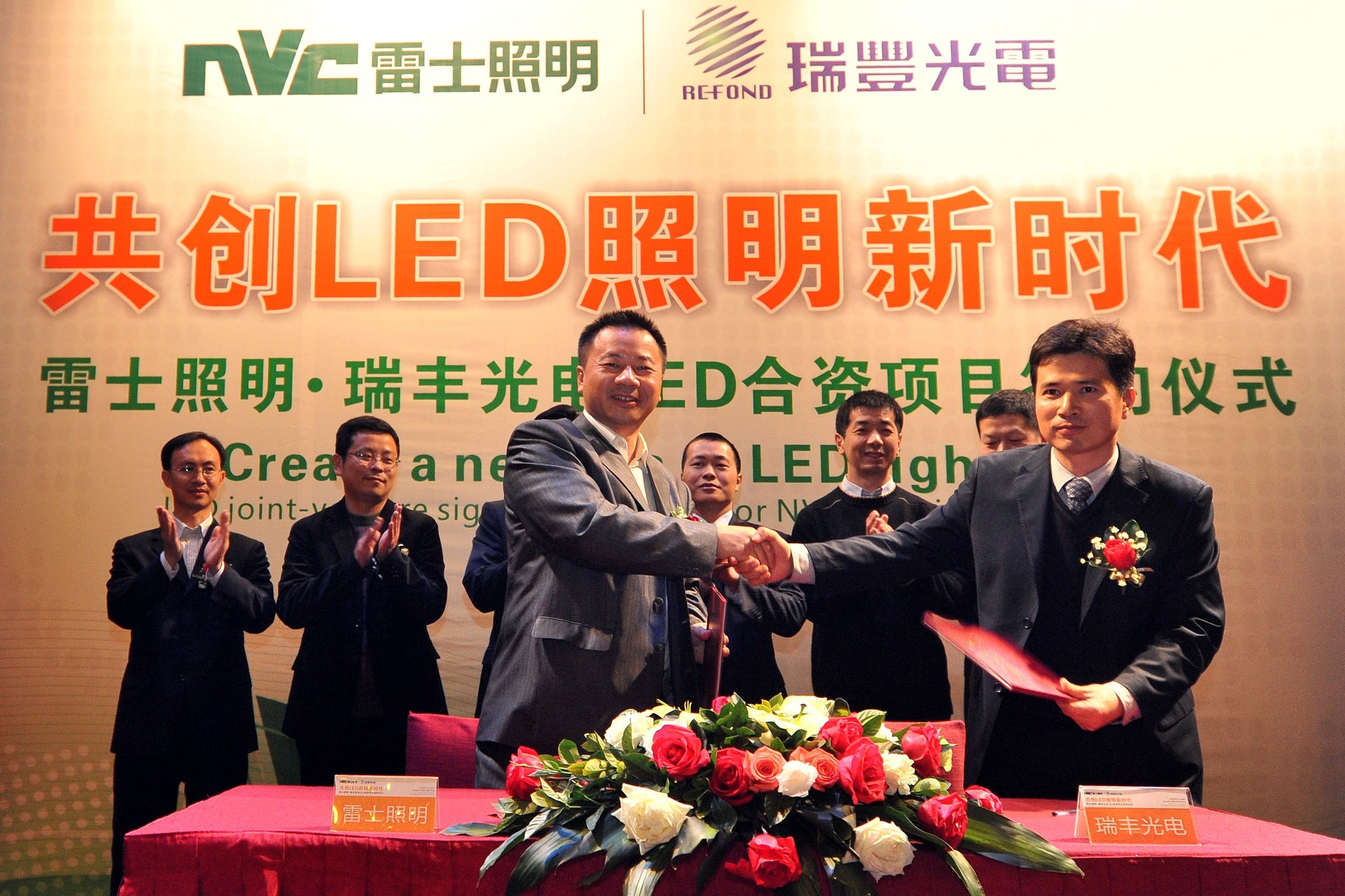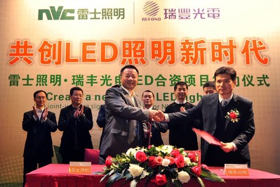 惠州2012年1月16日電 /美通社亞洲/ -- 2012年1月13日,中國照明行業龍頭企業 -- 雷士照明(香港主板上市代號:2222.HK)與中國領先的LED封裝企業 -- 瑞豐光電(全稱“深圳市瑞豐光電子股份有限公司”,股票代碼:300241.SZ)在廣東惠州舉行“共創LED照明新時代 -- 雷士照明·瑞豐光電LED合資項目簽約啟動儀式暨新聞發布會”活動,雙方強強聯合,優勢互補,資源共享,開啟一個共贏 LED 照明新局面,全面推動行業 LED 產業鏈升級與發展變革。
