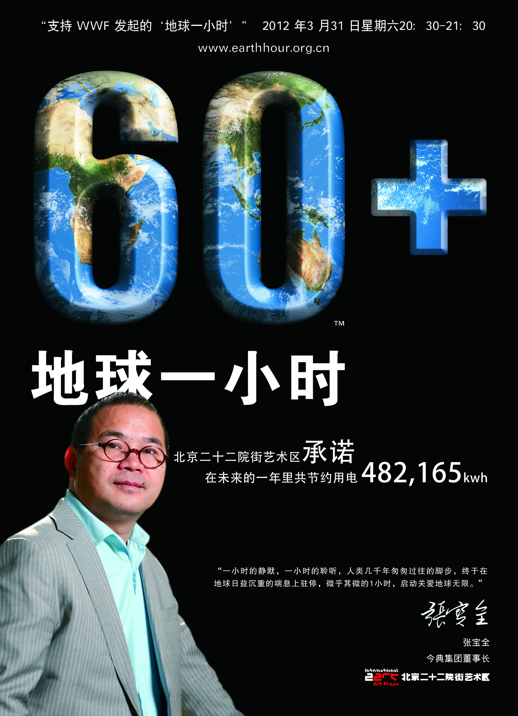 地球一小時是WWF發起的一個全球性的倡議,倡議全球個人、商業組織以及政府部門為了地球環境做出一個行為改變的承諾,并于2011年3月26日晚8點30分關燈1小時。地球一小時活動起源于2007年的澳大利亞,當時有220萬人熄滅了燈光。到了2010年,橫跨每一個大洲的128個國家,有4616座城市,創紀錄的13億人自愿參與了地球一小時活動。數以百萬計的中國民眾也參與其中,其中33個中國城市宣布參與地球一小時。