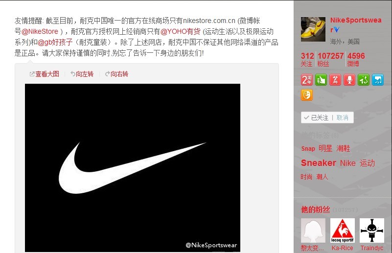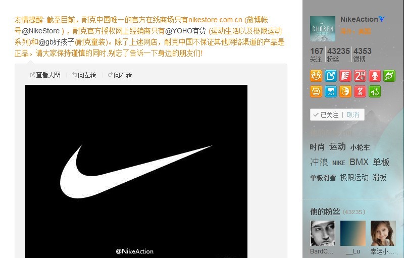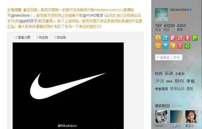 微博原文:“友情提醒:截至目前,耐克中國(guó)唯一的官方在線商場(chǎng)只有 nikestore.com.cn,耐克官方授權(quán)網(wǎng)上經(jīng)銷商只有‘YOHO!有貨’(運(yùn)動(dòng)生活系列及極限運(yùn)動(dòng)系列)和‘好孩子’(耐克童裝)。除上述網(wǎng)店,耐克中國(guó)不保證其他網(wǎng)絡(luò)渠道的產(chǎn)品是正品。請(qǐng)大家保持謹(jǐn)慎的同時(shí),別忘了告訴一下身邊的朋友們!”