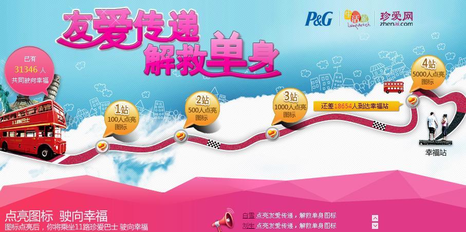 此次活動集合了珍愛網、寶潔以及國內各大電商網站(天貓、京東商城、亞馬遜、一號店、蘇寧易購、繽購網、當當網),全網覆蓋為解救單身提供了更全面和方便的方式。在生活家網站上參與 “‘友’愛傳遞,解救單身”活動,分享情感專家的脫光秘籍并@上你的單身好友,即可參加iPad 2抽獎,更可獲得在所選電商平臺的寶潔產品購物券,以優惠價格購得產品并造就“脫光”大變身;單身好友更有機會被抽中獲得珍愛網2999元的珍愛通紅娘服務。通過該活動注冊成為每日前1000名的珍愛網新用戶,亦將獲得試用會籍擁有3枚珍愛幣,以此購買禮物可更好地接近心儀對象。珍愛網負責人表示:“過去普通會員只能向對方‘送秋波’,參與該活動獲得珍愛幣,就可以有更多示愛表白的機會。在寶潔‘脫單’產品的幫助下再乘勝出擊約見心儀會員,將是一次加速脫光的好機會!”