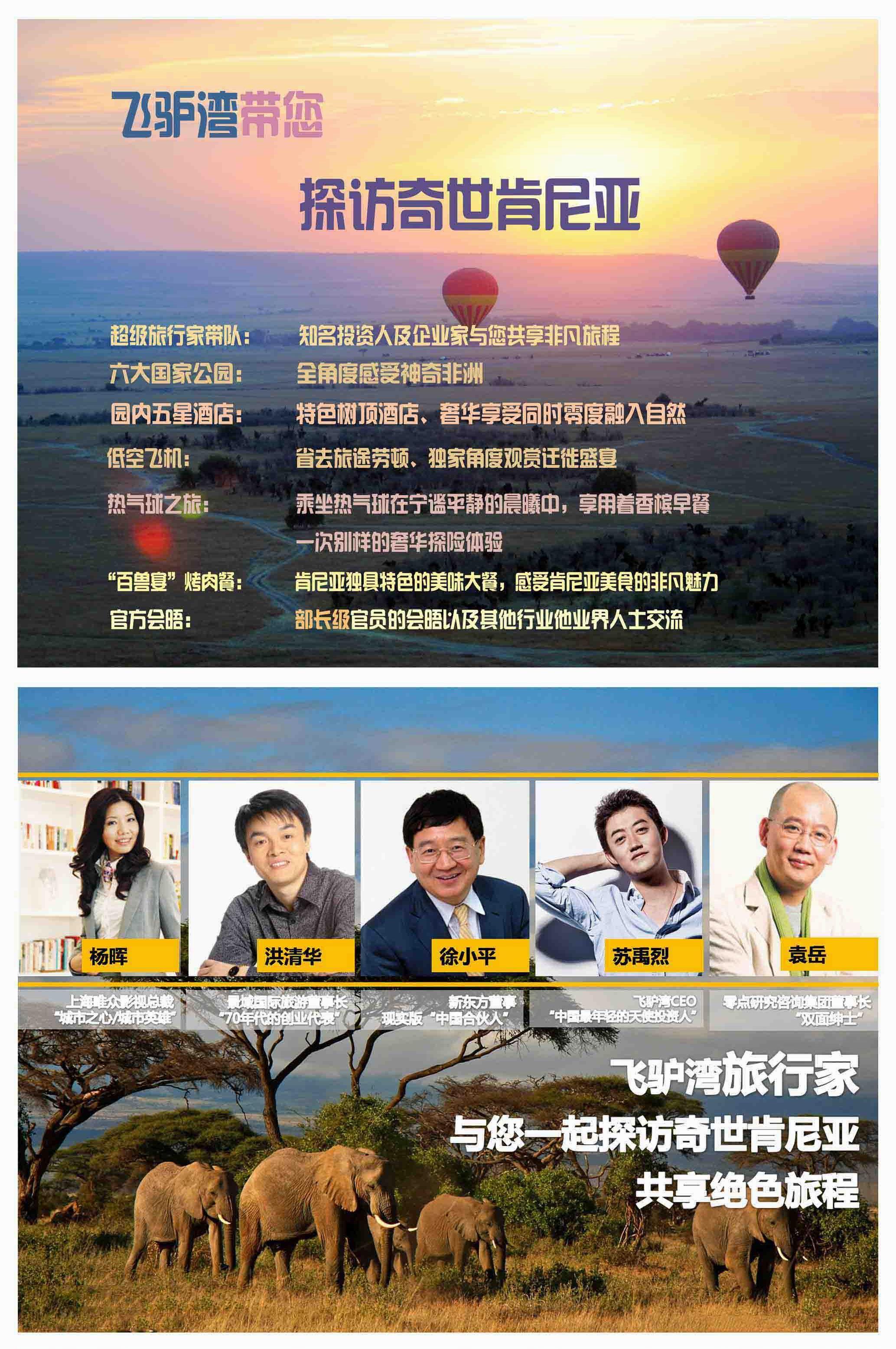 值得一提的是,“飛驢灣”行程的特色除了感受旅途中別樣的風景以外,核心的部分是人文元素,引入名人帶隊機制,讓游客近距離接觸各行業領袖,拓展人與人之間的交流。具體到肯尼亞的行程,則是特邀徐小平帶隊,團隊成員可以在旅途中與他交流創業心得、投資之道,而在肯尼亞當地還將安排一次官方會晤,團隊成員將有機會參與部長級的會晤以及各行業業界人士的交流。