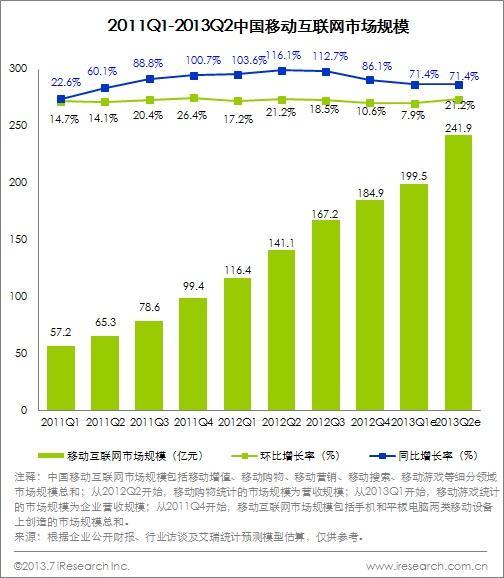 北京2013年8月1日電 /美通社/ -- 艾瑞咨詢數據顯示,2013年第二季度中國移動互聯網市場規模達到241.9億元,同比增速71.4%,移動互聯網經過兩年的沉淀和積累,市場正朝向理性健康的方向發展,移動互聯網商業化價值逐漸凸顯。