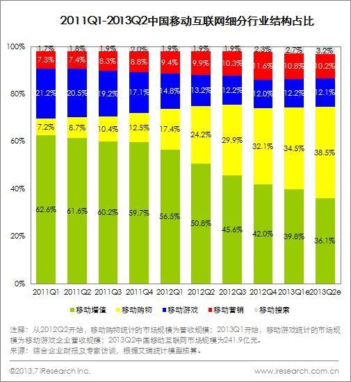 2013年第二季度移動購物市場繼續保持高速增長態勢,市場占比超越移動增值,成為移動互聯網第一大細分行業。主要原因在于:一是傳統增值服務增長疲軟,移動增值市場份額逐漸萎縮;二是移動購物受傳統電商市場增長驅動,市場保持高速增長,另外用戶移動購物習慣逐漸形成,進一步推動移動購物成為移動互聯網第一大細分行業。艾瑞預計,移動購物未來將繼續保持第一細分行業地位,引領移動互聯網市場規模實現新突破。